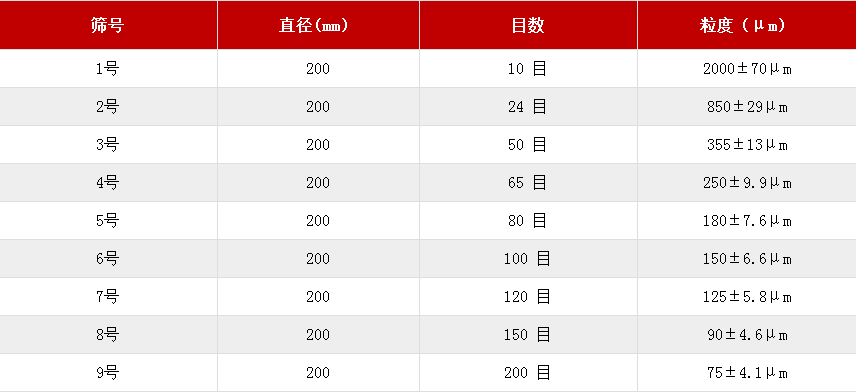 按照《中國藥典》規(guī)定,標(biāo)準(zhǔn)藥典篩網(wǎng)孔需符合GB/T6003-2012(即國際標(biāo)準(zhǔn)ISO3310),其網(wǎng)孔基本尺寸為金屬絲編織網(wǎng)試驗(yàn)篩2.36mm-0.020mm,篩網(wǎng)材質(zhì)需為不易和物料發(fā)生反應(yīng)的優(yōu)質(zhì)304不銹鋼構(gòu)成。國家規(guī)定的一套標(biāo)準(zhǔn)藥典篩由9個(gè)不同目數(shù)的篩格組成,依次按篩孔內(nèi)徑從大到小排成9個(gè)序號,即從1號篩開始篩孔內(nèi)徑依次減小,9號篩的篩孔內(nèi)徑最小,檢驗(yàn)粒度最細(xì)。具體1~9號藥典篩目數(shù)對照表如下圖: